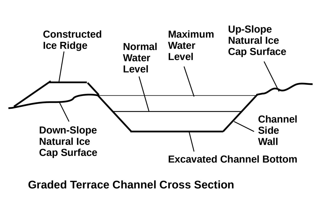 In the actual construction of the melt water collection channels, each channel will terminate near the glacier edge flowing into the impounded portion of Tasersiaq Lake. Each channel will extend out from the lake toward the most distant outer edge of the collection area. North of Tasersiaq Lake a total of 50 terrace channels will extend to a point approximately 140 km north of the lake catchment. South of Tasersiaq Lake a total of 38 terrace channels will extend to a point approximately 105 km south of the lake catchment. Since each channel will follow the contours of the glacial topography the actual length of each channel will be an estimated 180 km in the north section and 140 km in the south section of terraces. Some channels may include branches in their outer reaches to improve collection efficiency. These branches, which will carry smaller quantities of water than the main channel, can have a shallower and narrower cross section and the combined cross section of all branches of a single terrace will decrease as it approaches the far end of the channel.